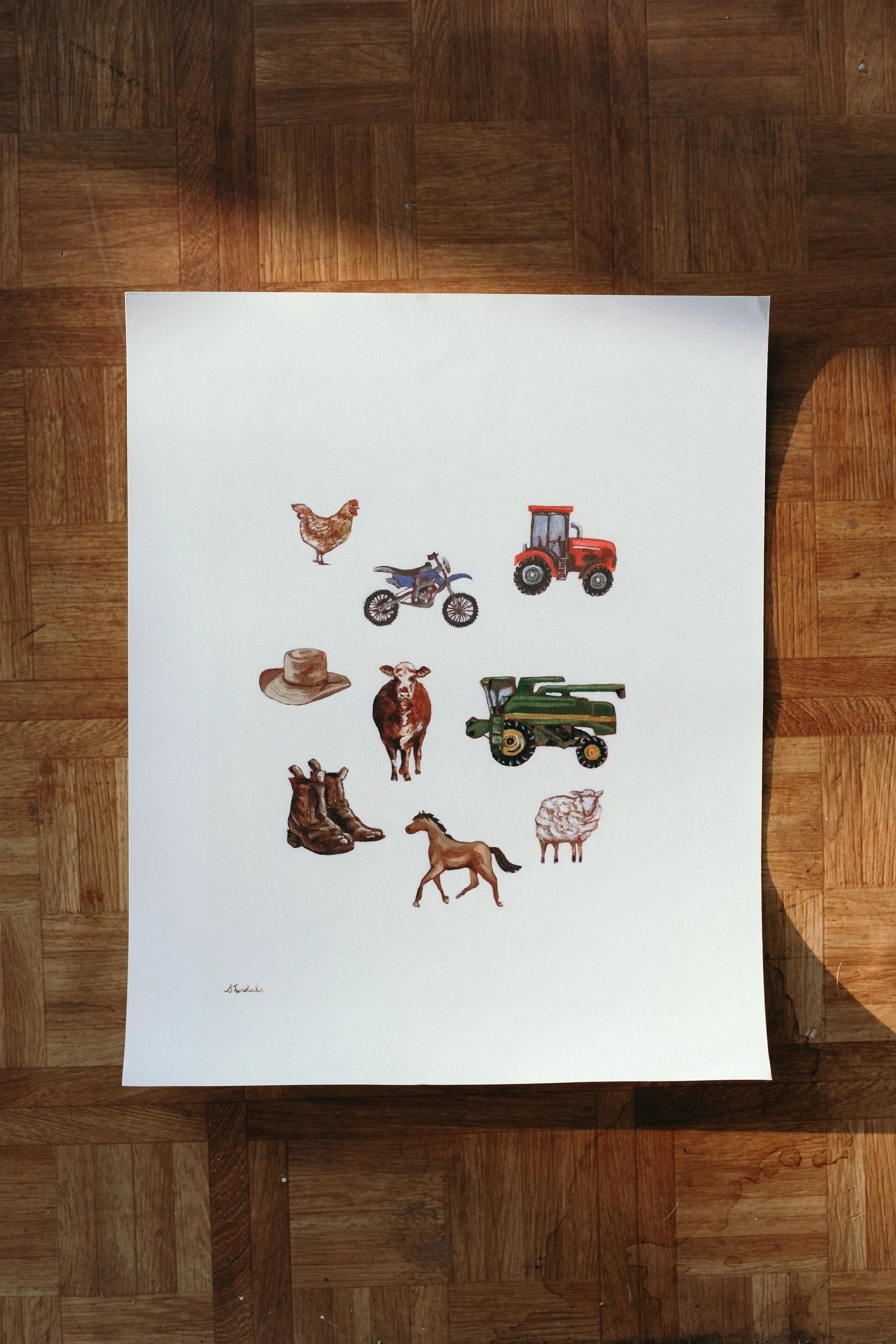 She grew up on a cattle and cropping property outside of Millmerran, where life was full. Full of noise, full of people, full of food, and full of work. That upbringing sits at the centre of her work. She paints what feels like home. Flowers, table settings, handwritten recipes, machinery, paddocks. Her landscapes and machinery reflect her father’s steady commitment to the land, showing up season after season regardless of what it brings. Her still life works draw from her mother’s warmth, the kind of hospitality that makes a house feel open to anyone who walks through the door.