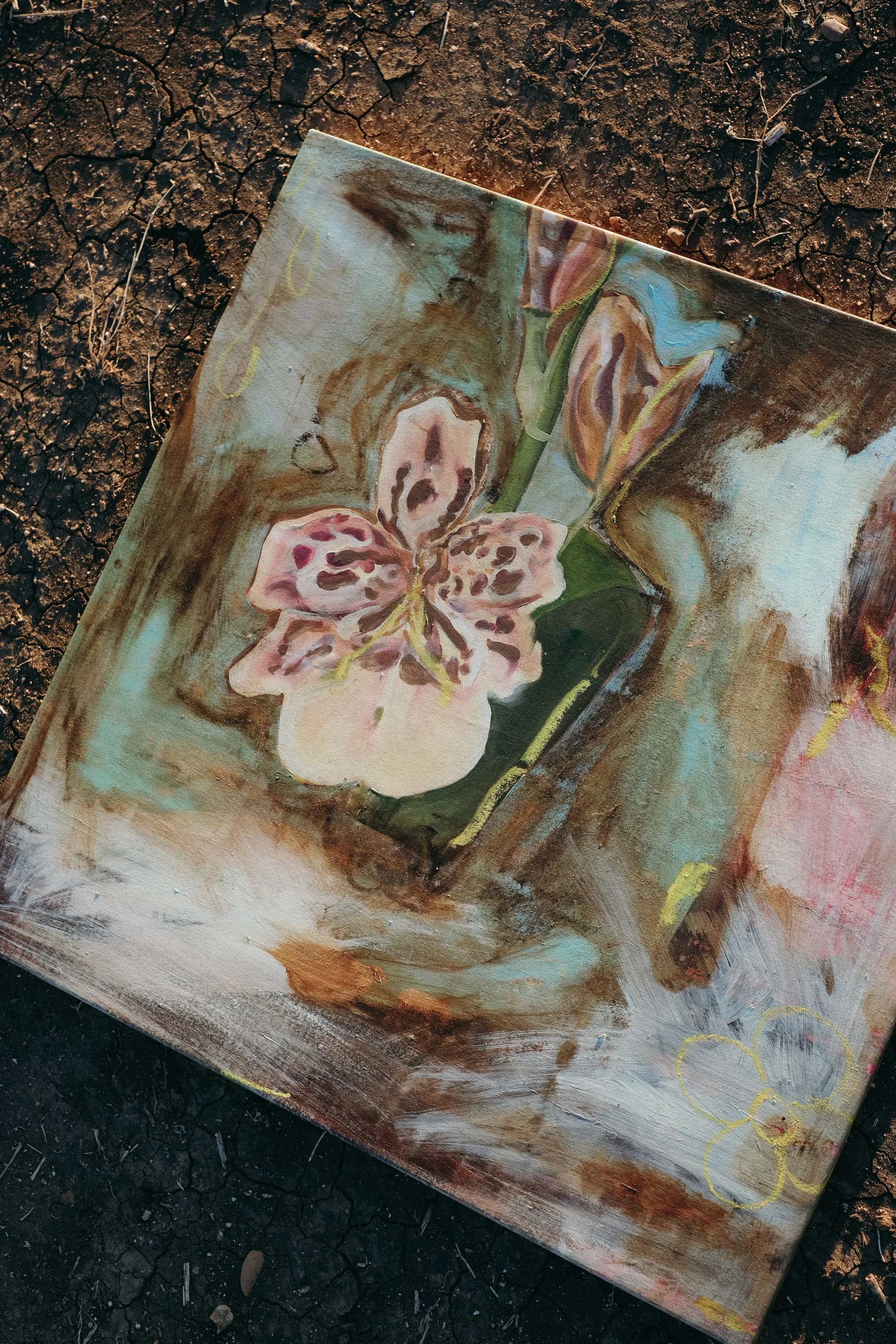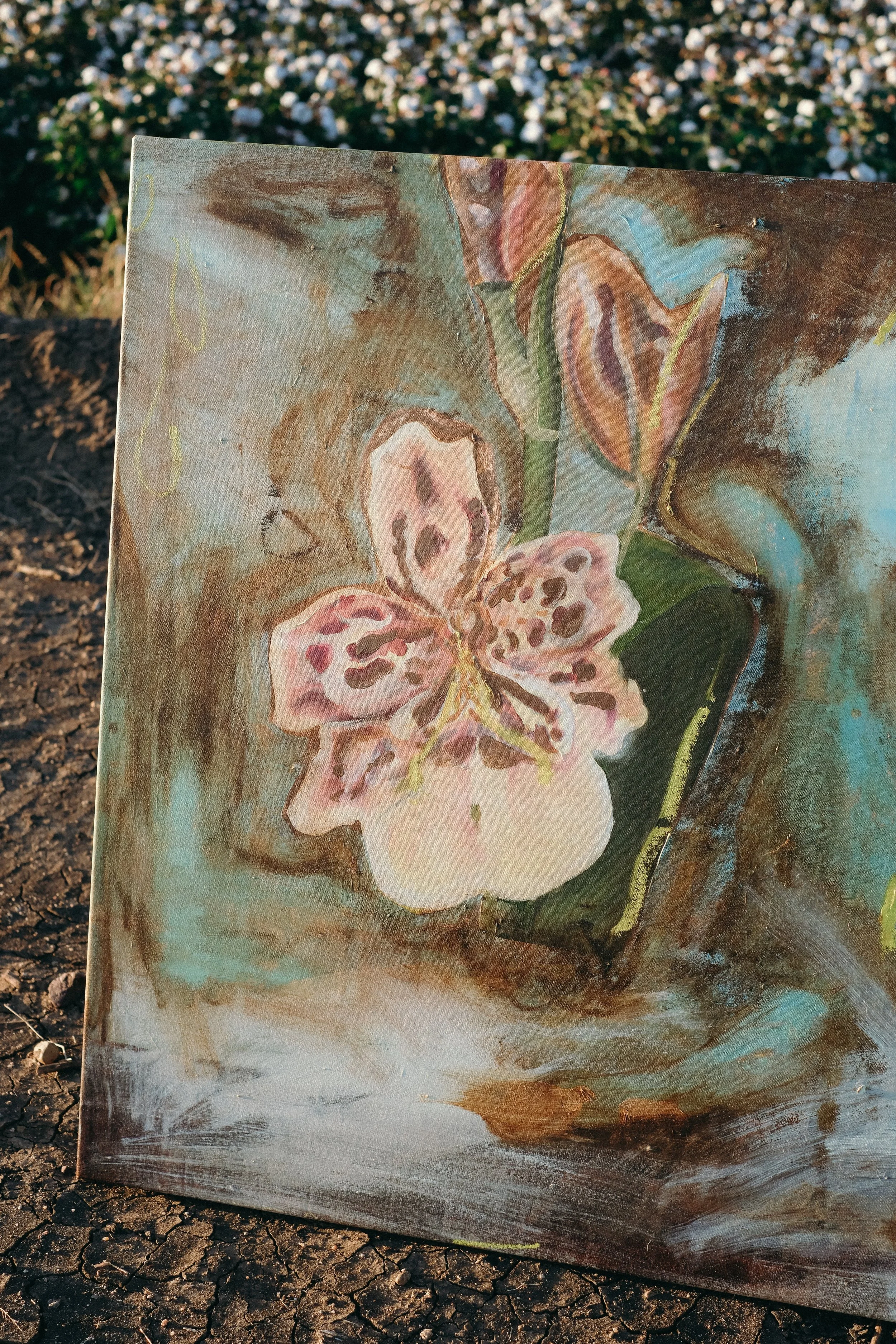 Her practice remains deliberately exploratory. While grounded in a background of printmaking, she is currently working across oil and acrylic, creating large-scale semi-abstract pieces built through layered, instinctive mark-making.