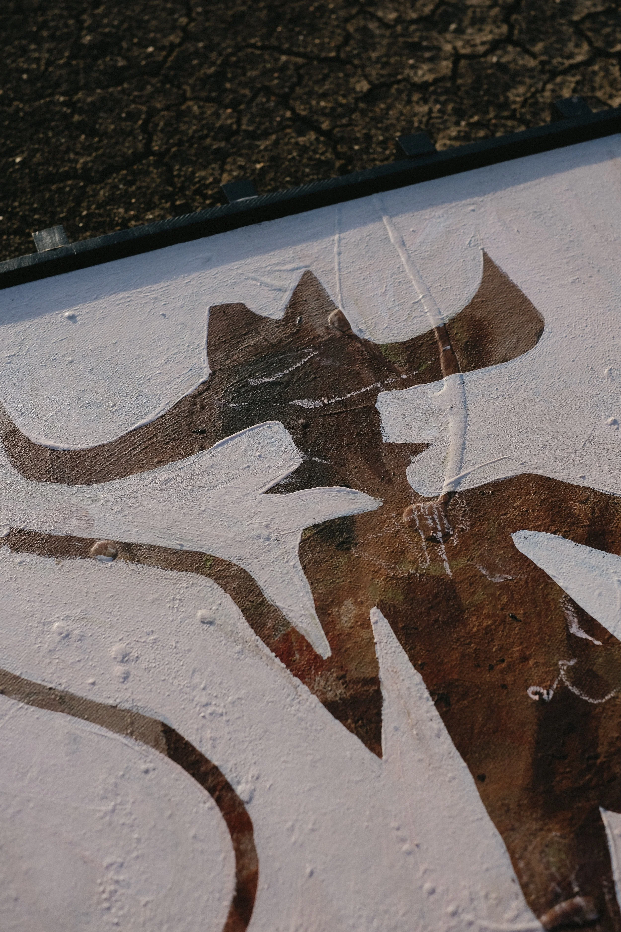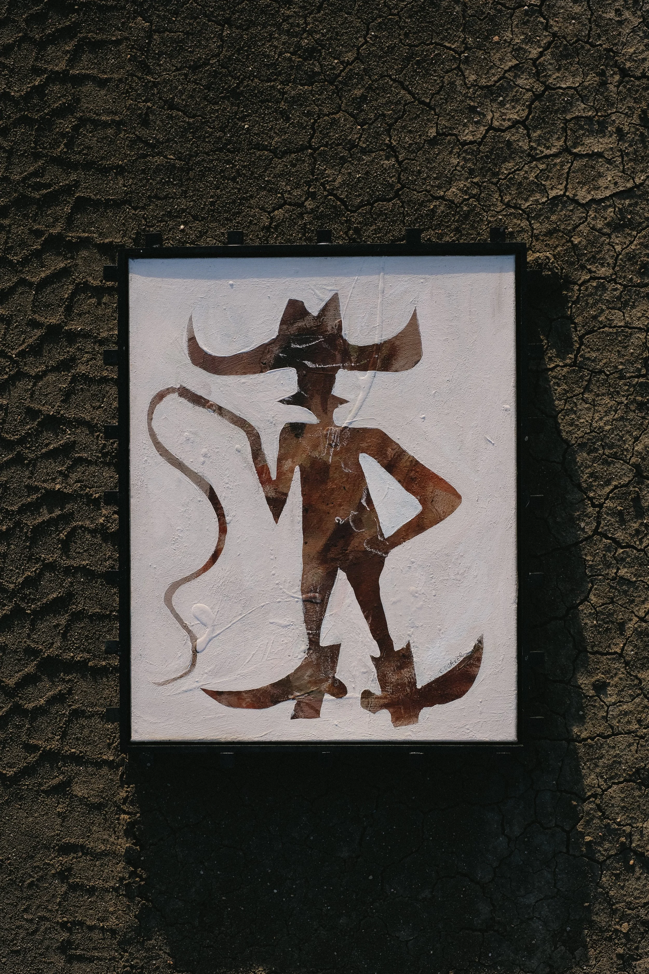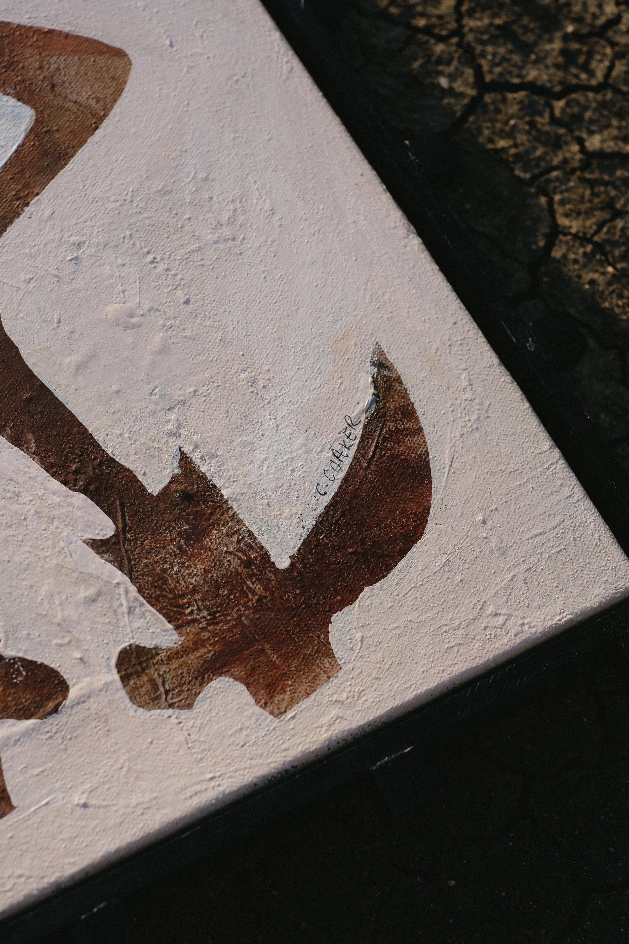 Her donated piece, FELLA #2, is the second in a series exploring bold text-based compositions layered with painterly elements. The work reflects her signature aesthetic. Casey’s background informs her sharp compositional sensibility. There is intention behind every placement, every contrast between surface and statement. The piece balances modern edge with organic imperfection.
