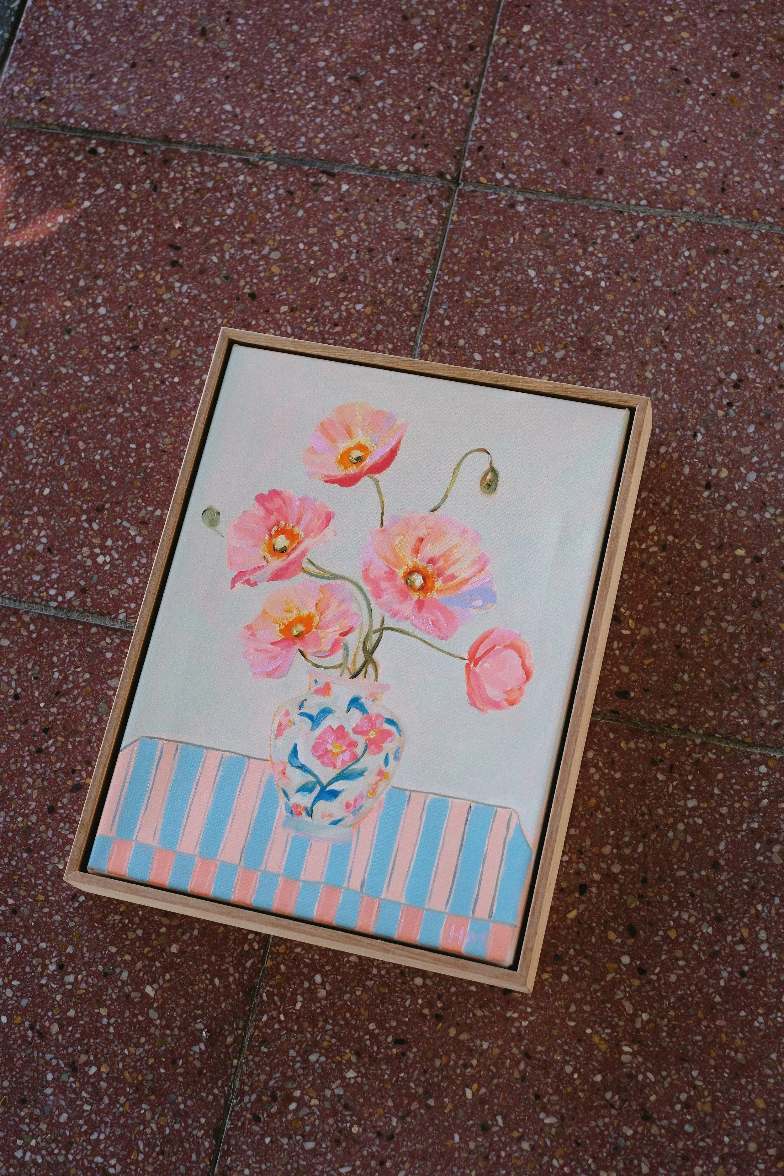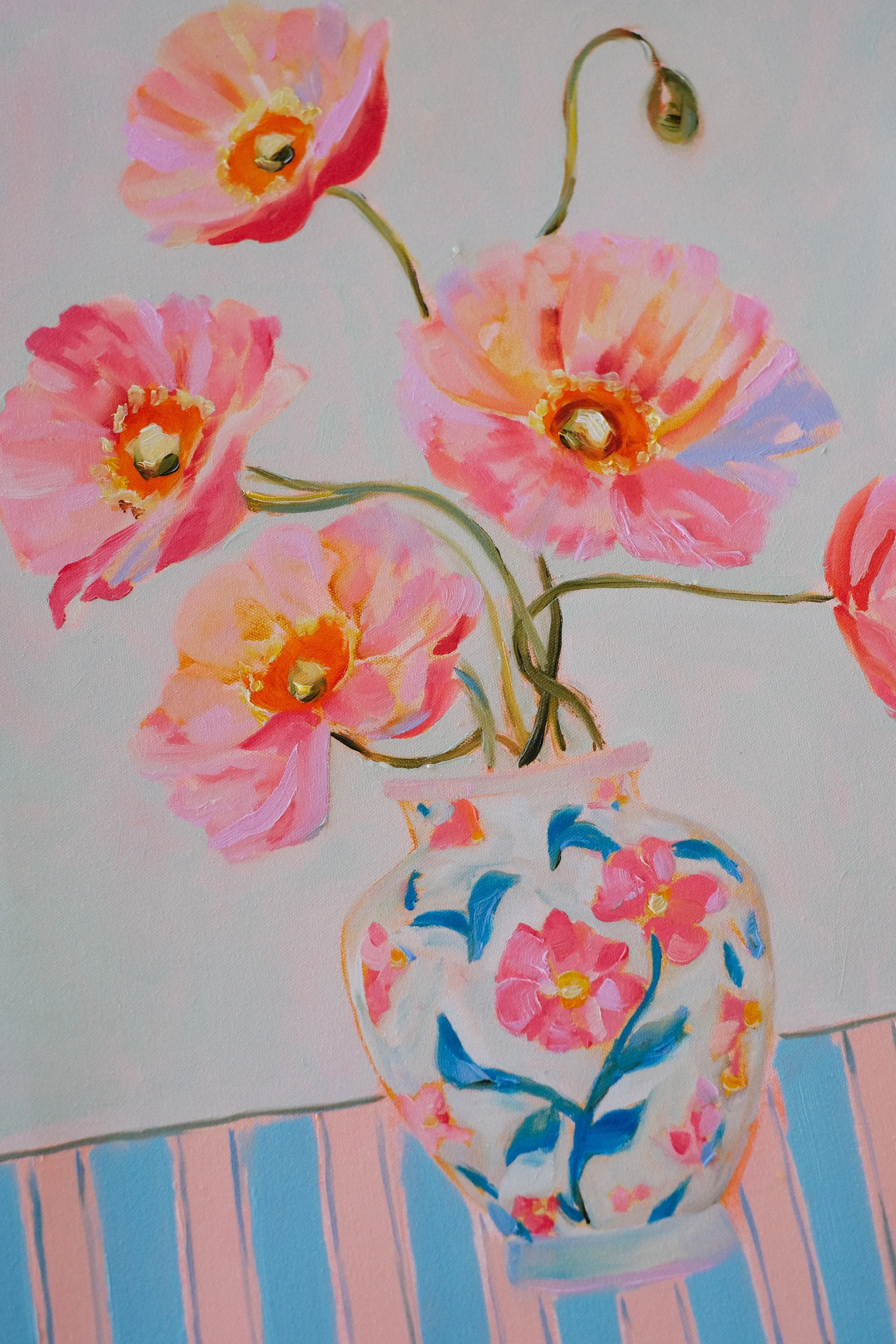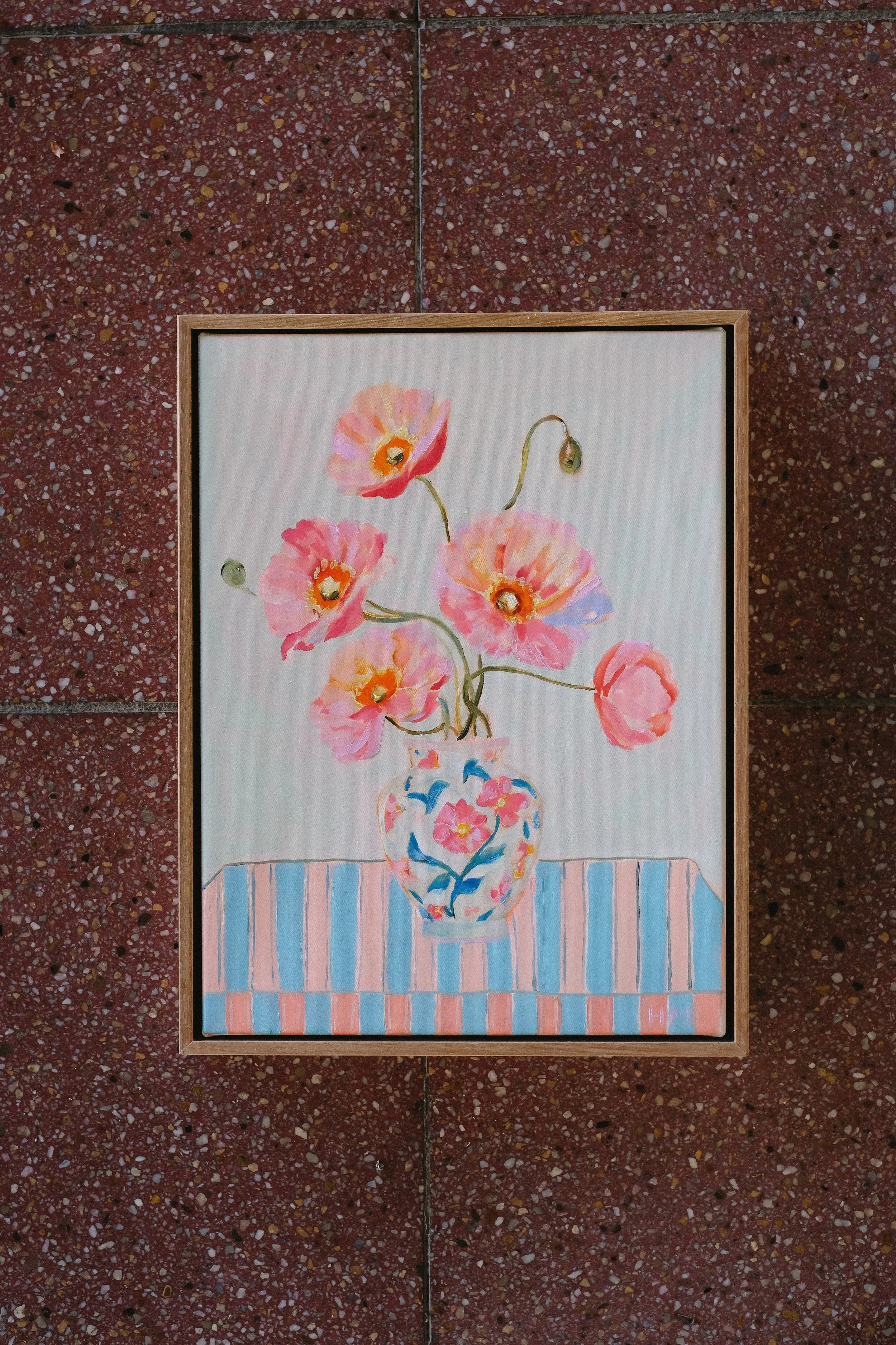 She works intuitively, building layers of oil paint through a mix of soft application and thicker, more textured passages. Still life gives her the structure to explore colour deeply, without distraction. The focus is on composition, pattern, and the way elements sit together on the canvas. Painting, for her, is a form of immersion.