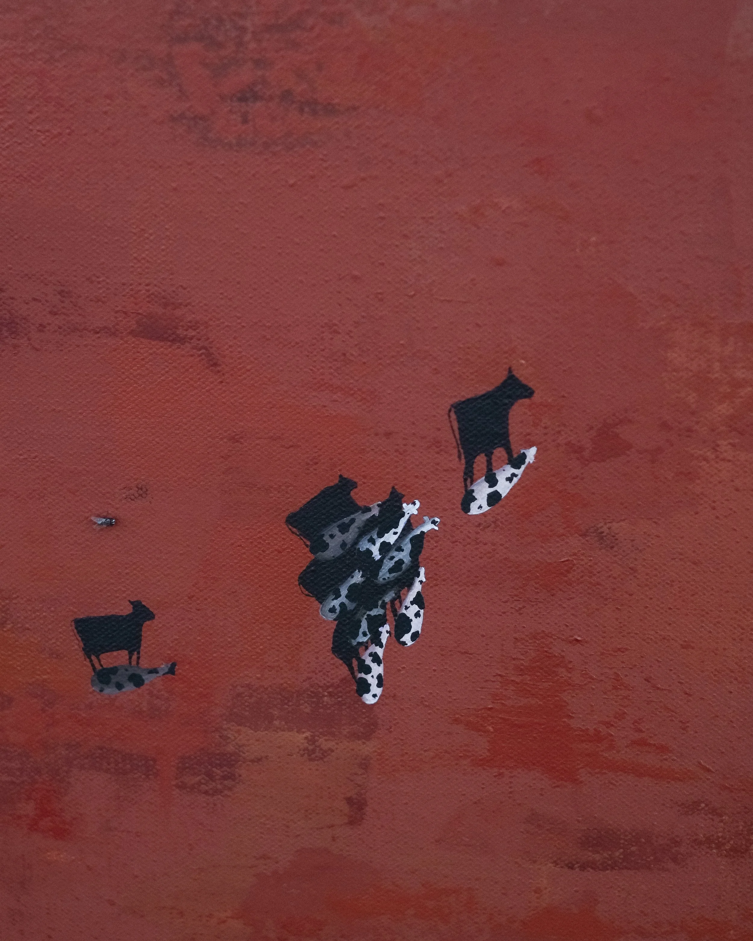 Her donated piece, Out Past The Fence Line, measures 76cm x 101cm x 3cm and is painted in acrylic on canvas. The scale gives the work presence. A small line of cattle moves across open pasture, their passage unhurried and familiar.
